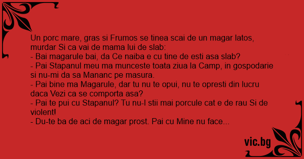 Un porc mare, gras si Frumos se tinea scai de un magar latos, murdar Si ca vai de mama lui de slab: