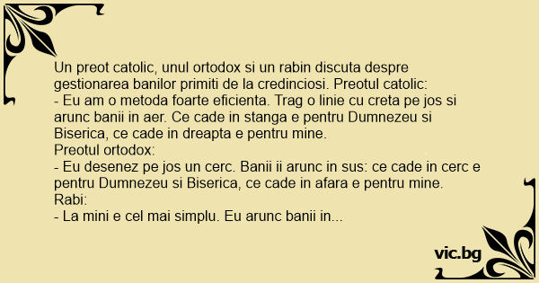 Un preot catolic, unul ortodox si un rabin discuta despre gestionarea banilor primiti de la credinciosi. Preotul catolic:
