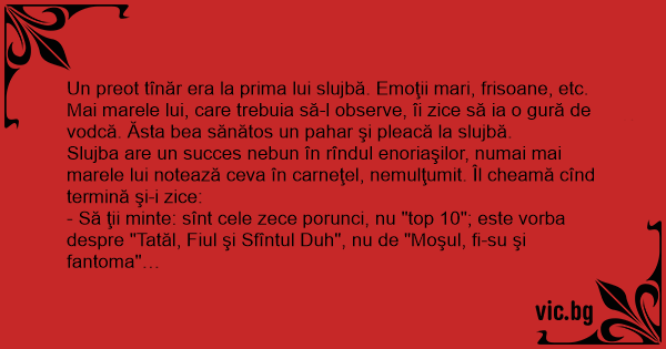 Un preot tînăr era la prima lui slujbă. Emoţii mari, frisoane, etc. Mai marele lui, care trebuia să-l observe, îi zice să ia o gură de vodcă. Ăsta bea sănătos un pahar şi pleacă la slujbă.
