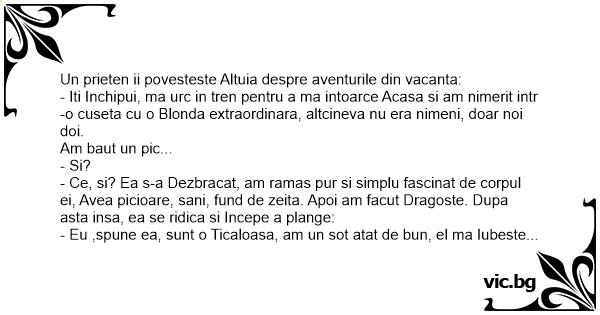 - Iti Inchipui, ma urc in tren pentru a ma intoarce Acasa si am nimerit intr-o cuseta cu o Blonda extraordinara, altcineva nu era nimeni, doar noi doi.