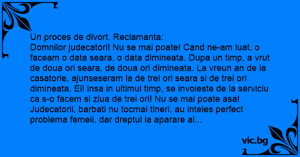 Domnilor judecatori! Nu se mai poate! Cand ne-am luat, o faceam o data seara, o data dimineata. Dupa un timp, a vrut de doua ori seara, de doua ori dimineata. La vreun an de la casatorie, ajunseseram la de trei ori seara si de trei ori dimineata. Ei! insa in ultimul timp, se invoieste de la serviciu ca s-o facem si ziua de trei ori! Nu se mai poate asa!