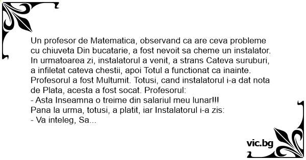 In urmatoarea zi, instalatorul a venit, a strans Cateva suruburi, a infiletat cateva chestii, apoi Totul a functionat ca inainte. Profesorul a fost Multumit. Totusi, cand instalatorul i-a dat nota de Plata, acesta a fost socat. Profesorul: