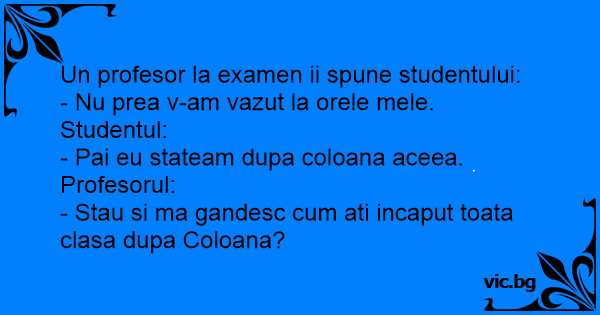 Un profesor la examen ii spune studentului:<br />- Nu prea v-am vazut la orele mele.<br />Studentul:<br />- Pai eu stateam dupa coloana aceea.<br />Profesorul:<br />- Stau si ma gandesc сuм ati incaput toata clasa dupa Coloana?