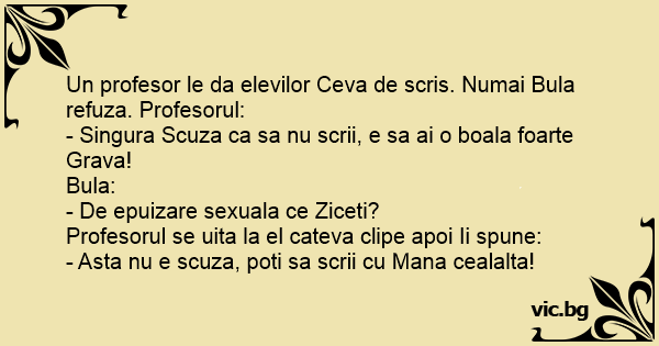 Un profesor le da elevilor Ceva de scris. Numai Bula refuza. Profesorul: