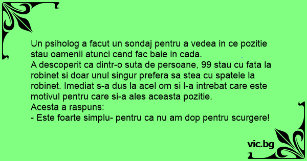 A descoperit ca dintr-o suta de persoane, 99 stau cu fata la robinet si doar unul singur prefera sa stea cu spatele la robinet. Imediat s-a dus la acel om si l-a intrebat care este motivul pentru care si-a ales aceasta pozitie.