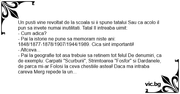 - Pai la geografie tot asa trebuie sa retinem tot felul De denumiri, ca de exemplu: Carpatii "Scurburii", Strimtoarea "Fosfor" si Dardanele, de parca mi-ar Folosi la ceva chestiile astea! Daca ma intraba careva Merg repede la un Internet Cafe, dau search pe Google Si aflu... simplu, nu?
