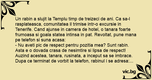 Un rabin a slujit la Templu timp de treizeci de ani. Ca sa-l rasplateasca, comunitatea il trimise intr-o excursie in Tenerife. Cand ajunse in camera de hotel, o tanara foarte frumoasa si goala statea intinsa in pat. Revoltat, pune mana pe telefon si suna acasa: