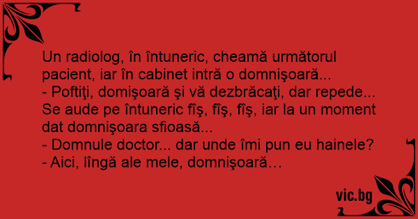 Un radiolog, în întuneric, cheamă următorul pacient, iar în cabinet intră o domnişoară...