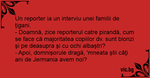 - Doamnă, zice reporterul catre pirandă, сuм se face că majoritatea copiilor dv. sunt blonzi şi pe deasupra şi cu ochi albaştri?