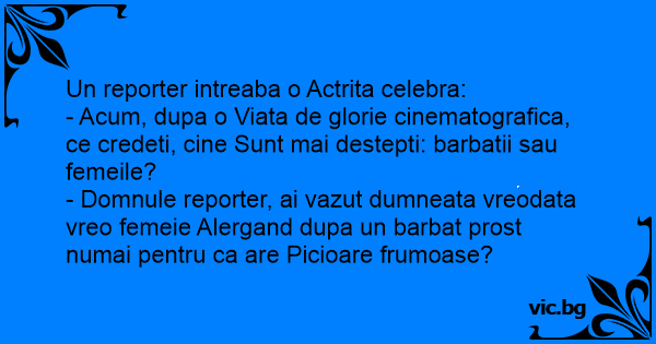 - Domnule reporter, ai vazut dumneata vreodata vreo femeie Alergand dupa un barbat prost numai pentru ca are Picioare frumoase?