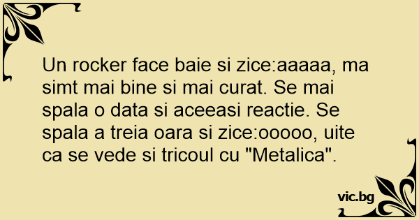 Un rocker face baie si zice:aaaaa, ma simt mai bine si mai curat. Se mai spala o data si aceeasi reactie. Se spala a treia oara si zice:ooooo, uite ca se vede si tricoul cu "Metalica".