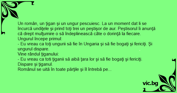 Un român, un ţigan şi un ungur pescuiesc. La un moment dat li se încurcă undiţele şi prind toţi trei un peştişor de aur. Peştisorul îi anunţă că drept mulţumire o să îndeplinească câte o dorinţă la fiecare.