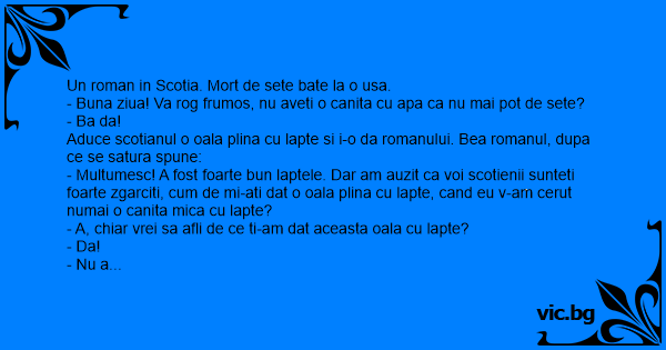 - Multumesc! A fost foarte bun laptele. Dar am auzit ca voi scotienii sunteti foarte zgarciti, сuм de mi-ati dat o oala plina cu lapte, cand eu v-am cerut numai o canita mica cu lapte?