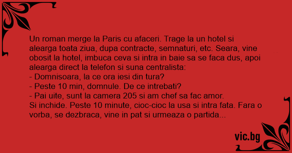 Un roman merge la Paris cu afaceri. Trage la un hotel si alearga toata ziua, dupa contracte, semnaturi, etc. Seara, vine obosit la hotel, imbuca ceva si intra in baie sa se faca dus, apoi alearga direct la telefon si suna centralista: