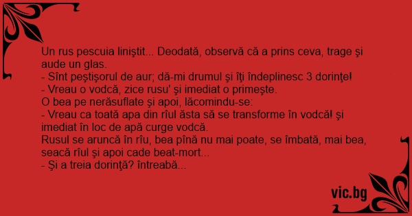 - Vreau ca toată apa din rîul ăsta să se transforme în vodcă! şi imediat în loc de apă curge vodcă.