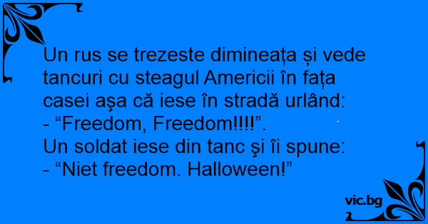 Un rus se trezeste dimineața și vede tancuri cu steagul Americii în fața casei aşa că iese în stradă urlând: