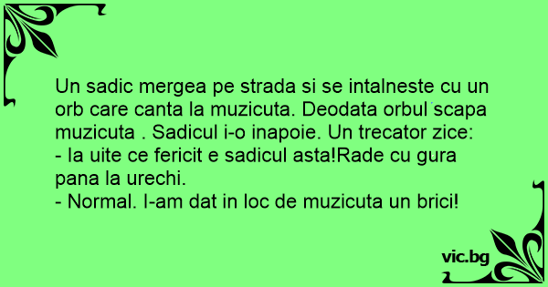 Un sadic mergea pe strada si se intalneste cu un orb care canta la muzicuta. Deodata orbul scapa muzicuta . Sadicul i-o inapoie. Un trecator zice: