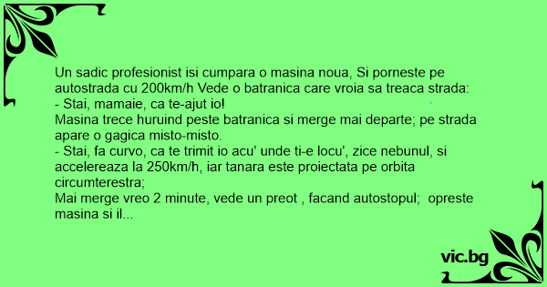 Un sadic profesionist isi cumpara o masina noua, Si porneste pe autostrada cu 200km/h Vede o batranica care vroia sa treaca strada: