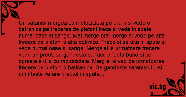 Un satanist mergea cu motocicleta pe drum si vede o batranica pe trecerea de pietoni trece si vede in spate numai oase si sange. Mai merge mai merge si vede pe alta trecere de pietoni o alta batrnica. Trece si se uita in spate si vede numai oase si sange. Merge si la urmatoare trecere vede un preot. se gandesta sa faca o fapta buna si se opreste si-l ia cu motocicleta. Merg ei si vad pe urmatoarea trecere de pietoni o battranica. Se gandeste satanistul , isi aminteste ca are preotul in spate si o ocoleste in ultimul moment. Se uita in spate si vede numai oase si sange si zice preotul:Ai ce baston i-am f***t!!!