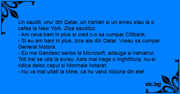 Un saudit, unu' din Qatar, un Iranian si un evreu stau la o cafea la New York. Zice sauditul: