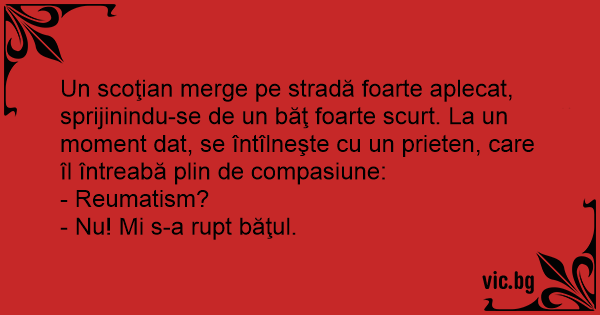 Un scoţian merge pe stradă foarte aplecat, sprijinindu-se de un băţ foarte scurt. La un moment dat, se întîlneşte cu un prieten, care îl întreabă plin de compasiune: