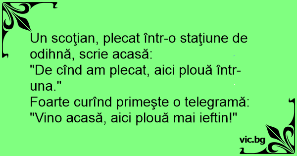 Un scoţian, plecat într-o staţiune de odihnă, scrie acasă:
