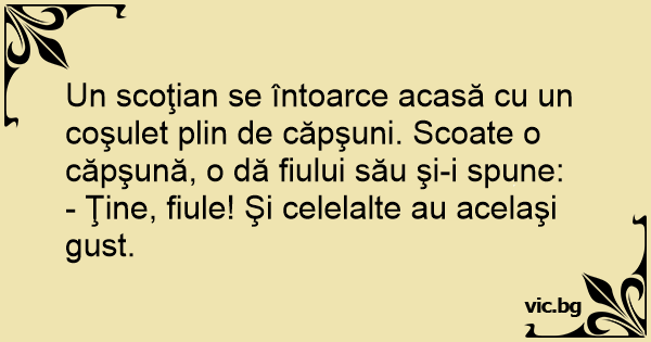 Un scoţian se întoarce acasă cu un coşulet plin de căpşuni. Scoate o căpşună, o dă fiului său şi-i spune: