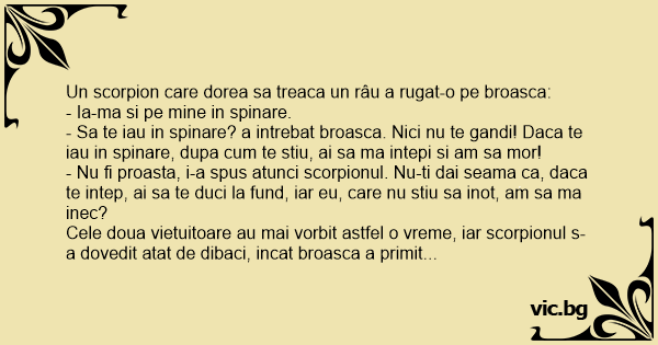 - Nu fi proasta, i-a spus atunci scorpionul. Nu-ti dai seama ca, daca te intep, ai sa te duci la fund, iar eu, care nu stiu sa inot, am sa ma inec?