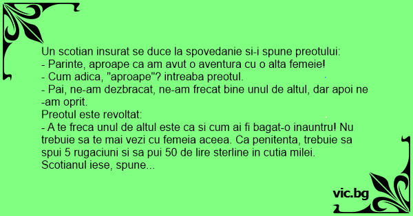 Un scotian insurat se duce la spovedanie si-i spune preotului: