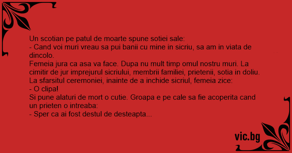 Femeia jura ca asa va face. Dupa nu mult timp omul nostru muri. La cimitir de jur imprejurul sicriului, membrii familiei, prietenii, sotia in doliu. La sfarsitul ceremoniei, inainte de a inchide sicriul, femeia zice: