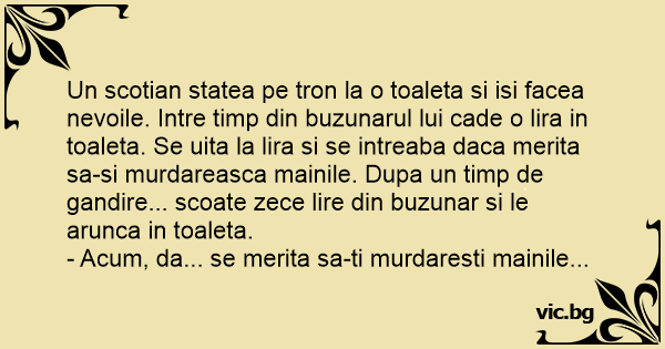 Un scotian statea pe tron la o toaleta si isi facea nevoile. Intre timp din buzunarul lui cade o lira in toaleta. Se uita la lira si se intreaba daca merita sa-si murdareasca mainile. Dupa un timp de gandire... scoate zece lire din buzunar si le arunca in toaleta.