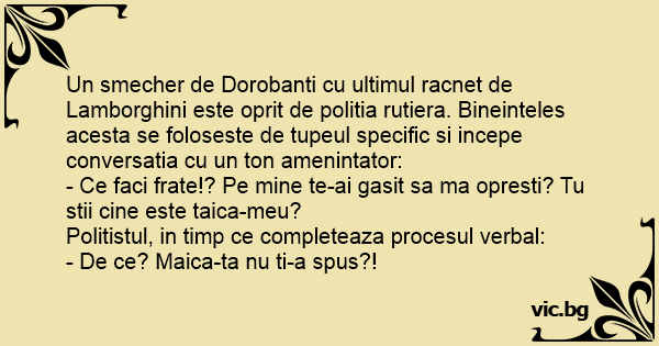 Un smecher de Dorobanti cu ultimul racnet de Lamborghini este oprit de politia rutiera. Bineinteles acesta se foloseste de tupeul specific si incepe conversatia cu un ton amenintator: