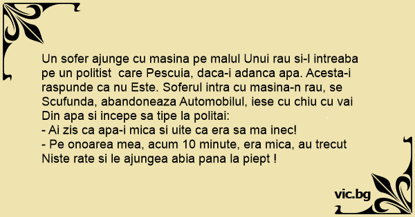 Un sofer ajunge cu masina pe malul Unui rau si-l intreaba pe un politist care Pescuia, daca-i adanca apa. Acesta-i raspunde ca nu Este. Soferul intra cu masina-n rau, se Scufunda, abandoneaza Automobilul, iese cu chiu cu vai Din apa si incepe sa tipe la politai: