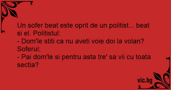 Un sofer beat este oprit de un politist... beat si el. Politistul: