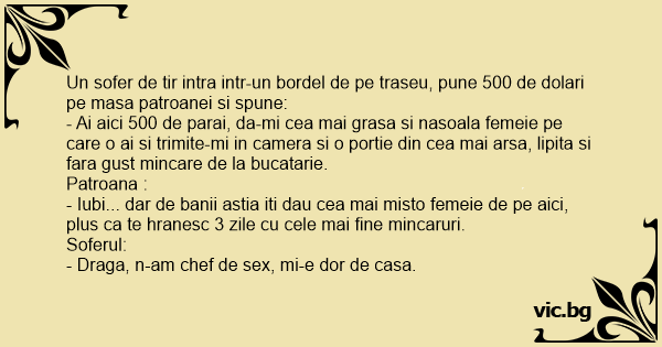 Un sofer de tir intra intr-un bordel de pe traseu, pune 500 de dolari pe masa patroanei si spune: