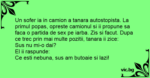 Un sofer ia in camion a tanara autostopista. La primul popas, opreste camionul si ii propune sa faca o partida de sеx pe iarba. Zis si facut. Dupa ce trec prin mai multe pozitii, tanara ii zice: