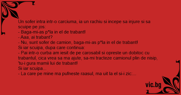 - Pai intr-o curba am iesit de pe carosabil si opreste un dobitoc cu trabantul, cica vrea sa ma ajute, sa-mi tracteze camionul plin de nisip, 'tu-i gura mamii lui de trabant!