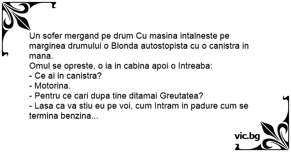 Un sofer mergand pe drum Cu masina intalneste pe marginea drumului o Blonda autostopista cu o canistra in mana. Omul se opreste, o ia in cabina apoi o Intreaba: - Ce ai in canistra? - Motorina. - Pentru ce cari dupa tine ditamai Greutatea? - Lasa ca va stiu eu pe voi, сuм Intram in padure сuм se termina benzina...