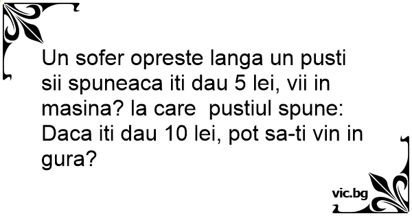 Un sofer opreste langa un pusti sii spuneaca iti dau 5 lei, vii in masina? la care pustiul spune: Daca iti dau 10 lei, рот sa-ti vin in gura?