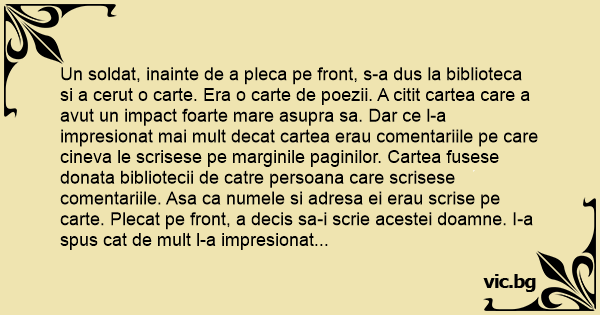 Un soldat, inainte de a pleca pe front, s-a dus la biblioteca si a cerut o carte. Era o carte de poezii. A citit cartea care a avut un impact foarte mare asupra sa. Dar ce l-a impresionat mai mult decat cartea erau comentariile pe care cineva le scrisese pe marginile paginilor. Cartea fusese donata bibliotecii de catre persoana care scrisese comentariile. Asa ca numele si adresa ei erau scrise pe carte. Plecat pe front, a decis sa-i scrie acestei doamne. I-a spus cat de mult l-a impresionat cartea si ce impact au avut comentariile pe care ea le scrisese pe marginile cartii. Si ea i-a scris inapoi. Asa au inceput sa corespondeze si cu cat isi scriau, relatia lor devenea din ce in ce mai puternica. Intr-una din scrisori, el i-a scris si a rugat-o sa-i trimita o fotografie. Ea i-a spus ca daca se simte apropiat de ea si daca dragostea lui este adevarata, nu va conta сuм arata. Asa ca nu i-a trimis nici o fotografie.. Cand s-a terminat razboiul si el s-a intors acasa si-au dat intalnire. Ca sa se recunoasca, ea l-a rugat sa tina cartea in mana, iar ea va avea un trandafir alb.