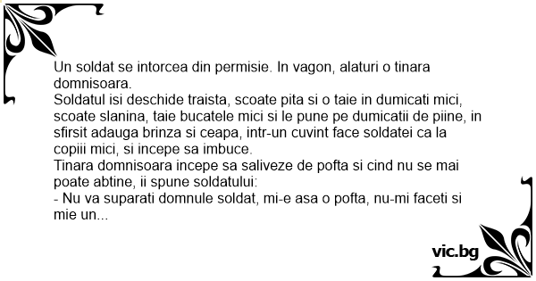 Tinara domnisoara incepe sa saliveze de pofta si cind nu se mai poate abtine, ii spune soldatului: