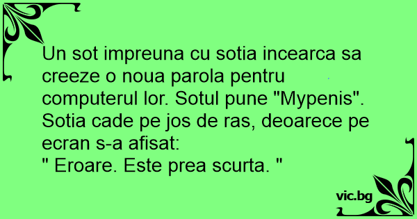 Un sot impreuna cu sotia incearca sa creeze o noua parola pentru computerul lor. Sotul pune "Mypenis". Sotia cade pe jos de ras, deoarece pe ecran s-a afisat:
