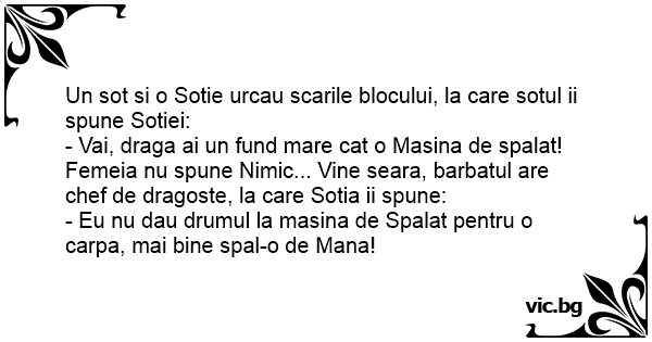 Un sot si o Sotie urcau scarile blocului, la care sotul ii spune Sotiei: