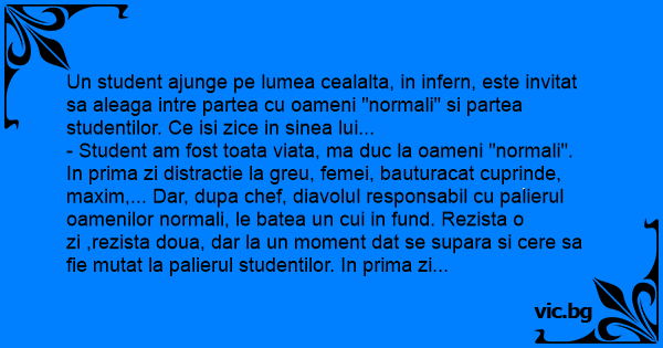 Un student ajunge pe lumea cealalta, in infern, este invitat sa aleaga intre partea cu oameni "normali" si partea studentilor. Ce isi zice in sinea lui...