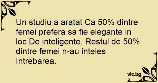 Un studiu a aratat Ca 50% dintre femei prefera sa fie elegante in loc De inteligente. Restul de 50% dintre femei n-au inteles Intrebarea.