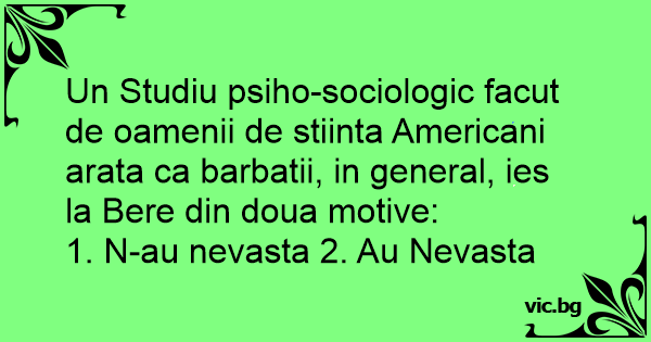 Un Studiu psiho-sociologic facut de oamenii de stiinta Americani arata ca barbatii, in general, ies la Bere din doua motive: