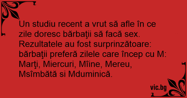 Un studiu recent a vrut să afle în ce zile doresc bărbaţii să facă sеx. Rezultatele au fost surprinzătoare: bărbaţii preferă zilele care încep cu M: Marţi, Miercuri, Mîine, Mereu, Msîmbătă si Mduminică.