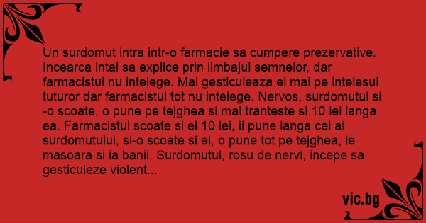 Un surdomut intra intr-o farmacie sa cumpere prezervative. Incearca intai sa explice prin limbajul semnelor, dar farmacistul nu intelege. Mai gesticuleaza el mai pe intelesul tuturor dar farmacistul tot nu intelege. Nervos, surdomutul si-o scoate, o pune pe tejghea si mai tranteste si 10 lei langa ea. Farmacistul scoate si el 10 lei, ii pune langa cei ai surdomutului, si-o scoate si el, o pune tot pe tejghea, le masoara si ia banii. Surdomutul, rosu de nervi, incepe sa gesticuleze violent injuraturi in limbajul semnelor. La care farmacistul: