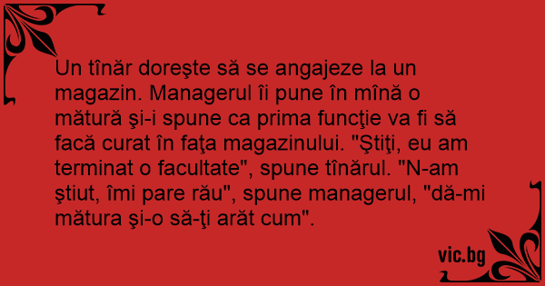 Un tînăr doreşte să se angajeze la un magazin. Managerul îi pune în mînă o mătură şi-i spune ca prima funcţie va fi să facă curat în faţa magazinului. "Ştiţi, eu am terminat o facultate", spune tînărul. "N-am ştiut, îmi pare rău", spune managerul, "dă-mi mătura şi-o să-ţi arăt сuм".
