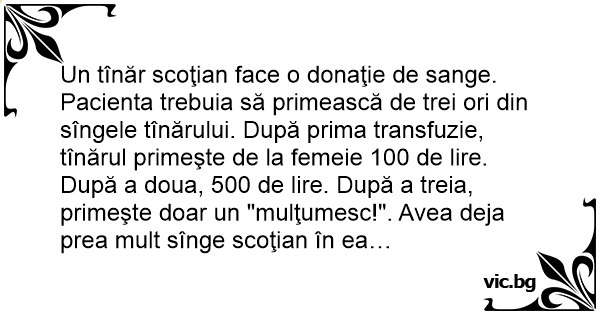 Un tînăr scoţian face o donaţie de sange. Pacienta trebuia să primească de trei ori din sîngele tînărului. După prima transfuzie, tînărul primeşte de la femeie 100 de lire. După a doua, 500 de lire. După a treia, primeşte doar un "mulţumesc!". Avea deja prea mult sînge scoţian în ea…